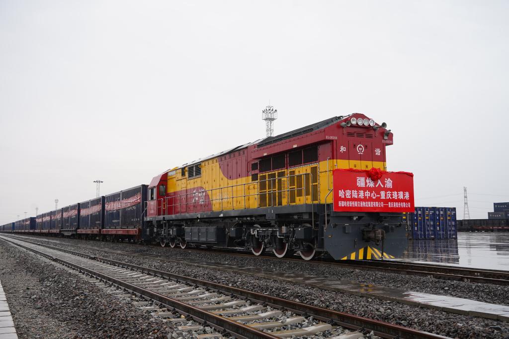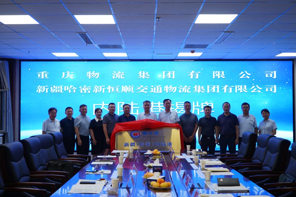 在哈密新恒顺交物集团,屈宏一行首先现场参观了铁路场站、冷链仓库以及陆港中心,详细了解了哈密陆港型国家物流枢纽的运营情况和承载的职责使命。随后,举行了“哈密内陆港—重庆珞璜港”班列发车仪式,该班列的开行,既是进一步落实今年6月疆渝两地签署的《全面深化战略合作框架协议》,揭开“疆煤入渝”新篇章的具体抓手,也是两地企业通过能源领域合作,服务和推动新时代西部大开发形成新格局的有力举措。
