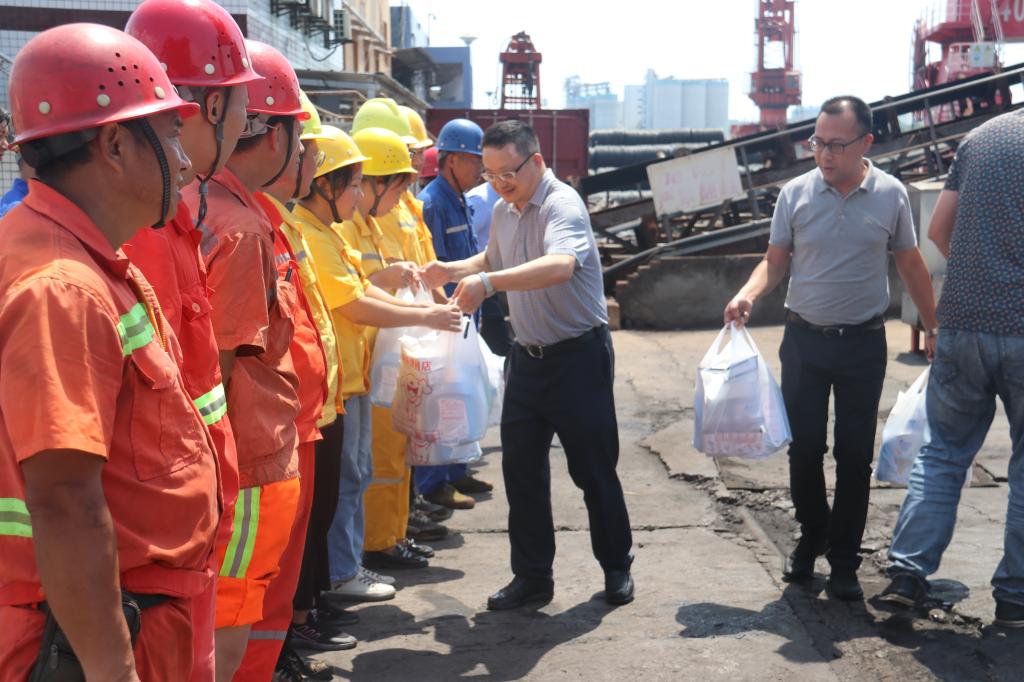 在江津公司,况勋华一行来到正在生产作业的综合码头,看望并慰问高温下奋战在生产一线的基层员工,为他们送上清凉消暑慰问物品,叮嘱大家在高温期间注意防暑降温,加强自我防护,劳逸结合,确保身体健康、工作安全。要求公司要错开高温时段作业,确保员工健康平安,港口生产稳定运行。江津公司在家班子成员陪同。